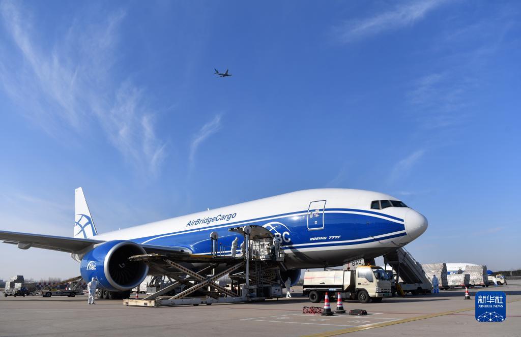 鄭州新鄭國際機場(chǎng)工作人員在為一架俄羅斯空橋貨運航空公司貨機裝貨(2021年12月30日)。新華社記者 李嘉南 攝