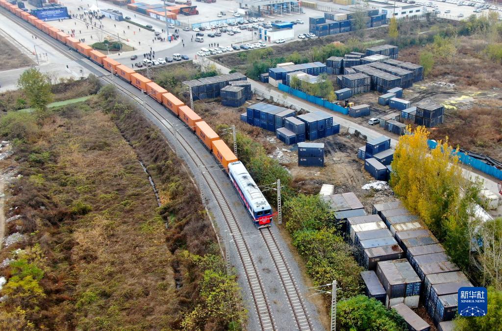 中國鄭州至芬蘭赫爾辛基的中歐班列駛出中國鐵路鄭州局集團有限公司圃田車(chē)站(2020年11月20日,無(wú)人機照片)。新華社記者 郝源 攝