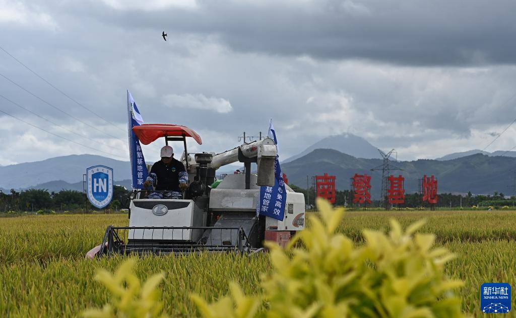在三亞市崖州區(壩頭)南繁公共試驗基地試驗示范點(diǎn)稻田,工作人員操作收割機收割水稻(2022年5月6日攝)。新華社記者 楊冠宇 攝