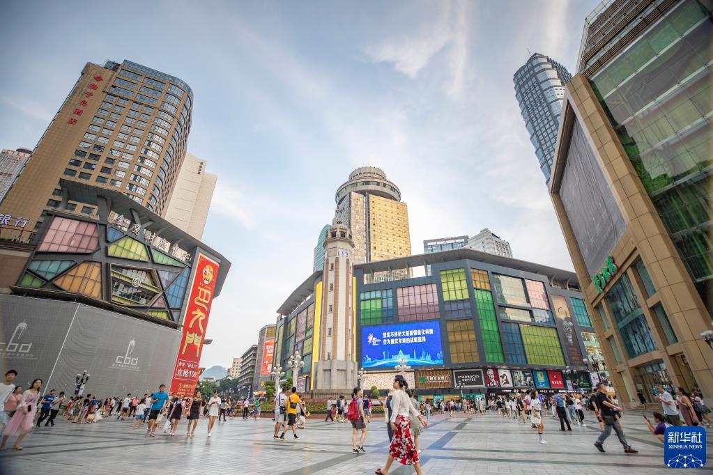 游客在重慶市渝中區解放碑步行街觀(guān)光游玩(2019年8月20日攝)。新華社記者 黃偉 攝