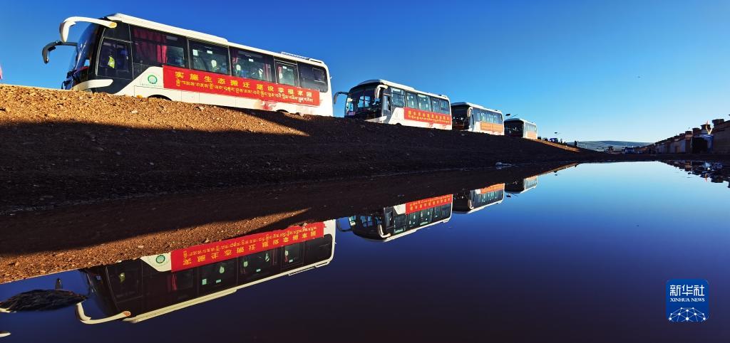 在西藏那曲市雙湖縣多瑪鄉拍攝的整裝待發(fā)的車(chē)隊,客車(chē)載著(zhù)牧民前往位于山南市貢嘎縣的森布日安置點(diǎn)(2022年7月19日攝)。新華社記者 沈虹冰 攝
