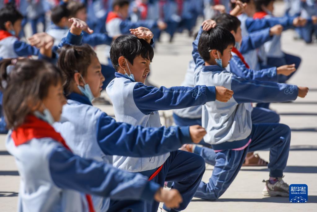 在新疆阿克蘇地區烏什縣依麻木鎮國家通用語(yǔ)言小學(xué),學(xué)生們在做課間操(2022年6月8日攝)。新華社記者 丁磊 攝