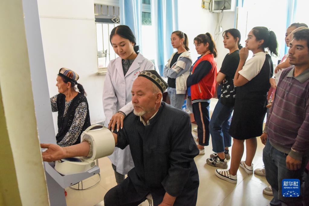 在新疆和田市伊里其鄉中心衛生院,居民接受免費健康體檢(2019年8月23日攝)。新華社記者 丁磊 攝