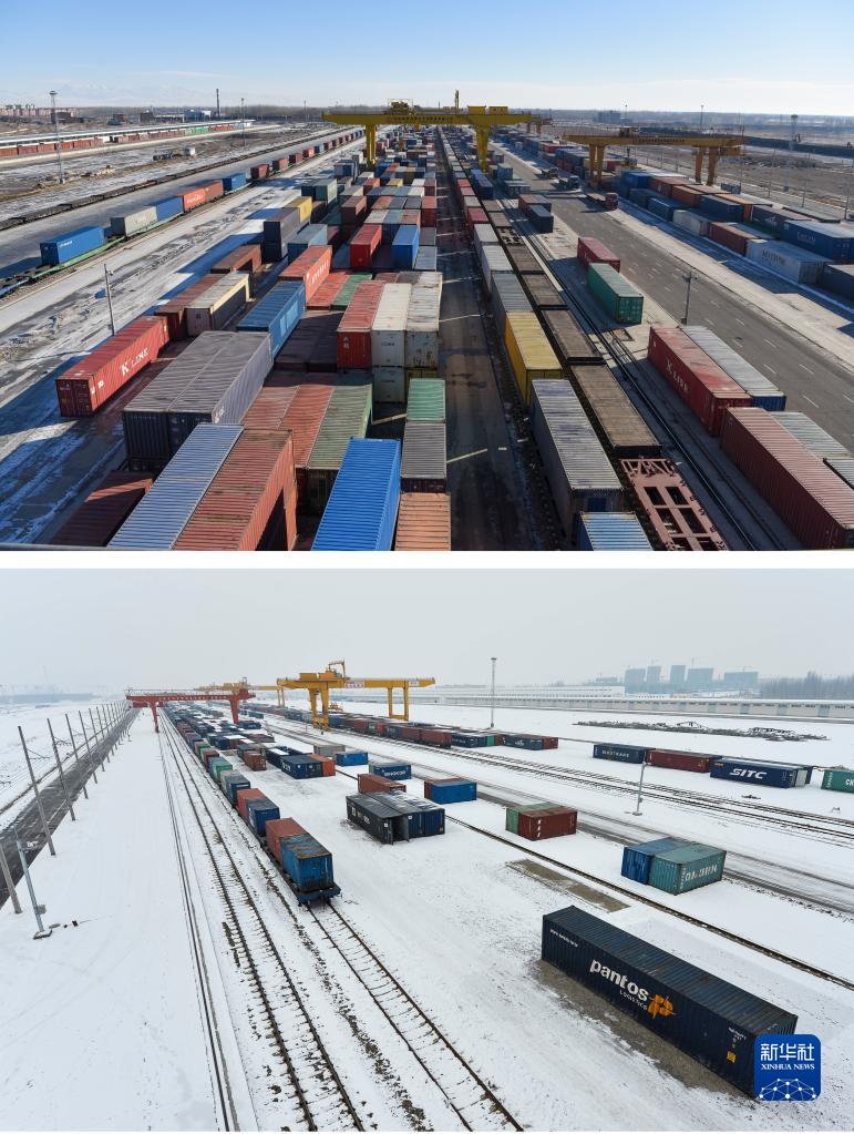 拼版照片:上圖為2021年2月6日拍攝的新疆霍爾果斯鐵路口岸換裝場(chǎng)內的換裝作業(yè)場(chǎng)景(新華社記者 丁磊 攝);下圖為2013年12月25日拍攝的新疆霍爾果斯火車(chē)站換裝場(chǎng)(新華社記者 江文耀 攝)。新華社發(fā)