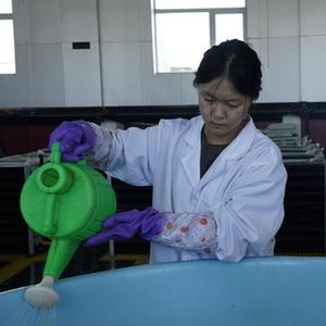7月6日,青海湖裸鯉救護中心沙柳河泉吉河增殖實(shí)驗站的技術(shù)人員在為小魚(yú)苗喂食。新華社記者陳杰 攝