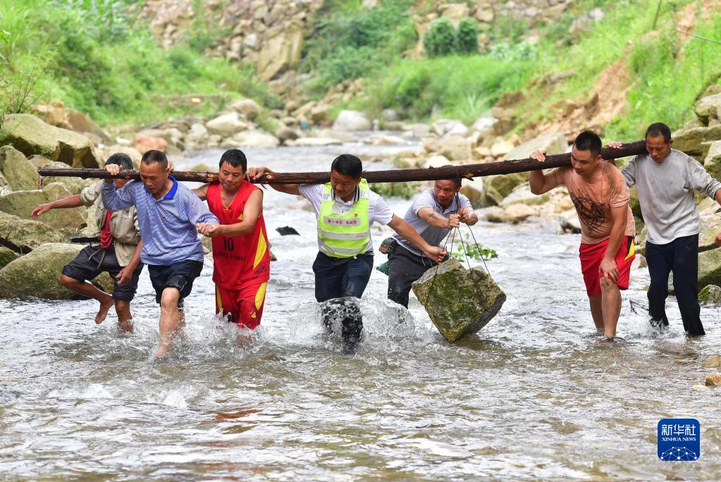 在位于黔桂交界大苗山深處的烏英苗寨,駐村第一書(shū)記韋桂華(右四)、黨員梁成兵(右三)、梁志新(左二)帶領(lǐng)村民維修河堤(2019年6月30日攝)。新華社記者 黃孝邦 攝