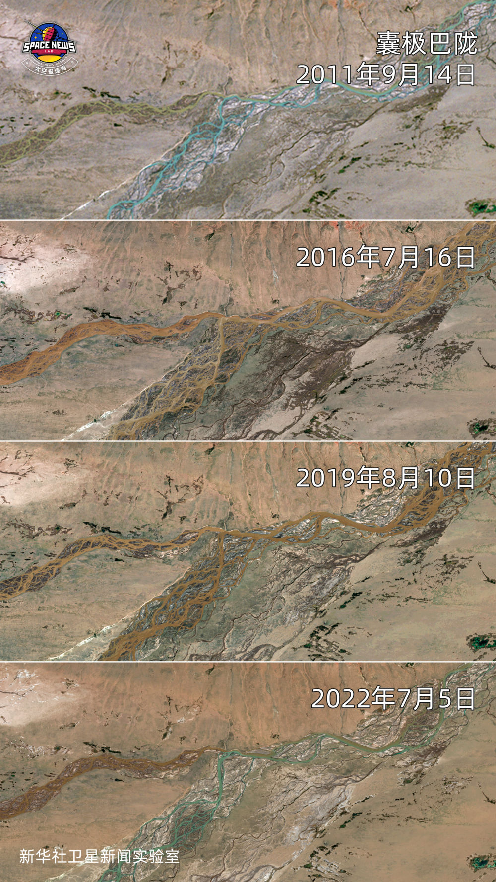 在長(cháng)江正源沱沱河和南源當曲匯合的囊極巴隴,不同時(shí)期的衛星圖像清晰顯示,江源水系河道沖淤頻繁,水流不斷分汊又匯集,鳥(niǎo)瞰就像在大地上扎起許多小辮子。