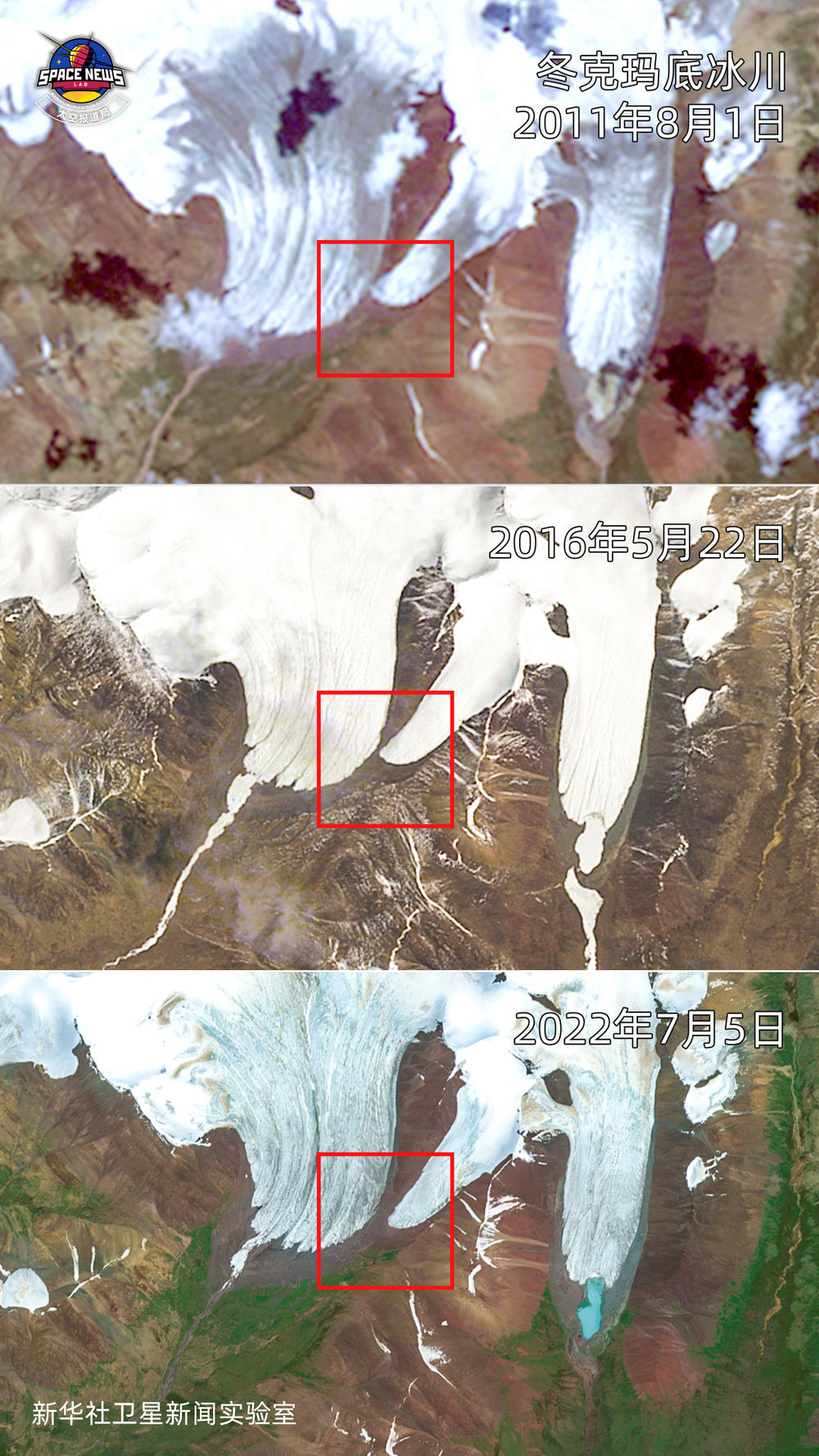 從冬克瑪底冰川不同年份衛星遙感圖像可以看出,在2011年冬克瑪底冰川還是一個(gè)整體,此后就陸續分為大、小冬克瑪底兩條冰川。紅框區域內變化,說(shuō)明兩條冰川末端之間距離逐漸拉大,處于消融退縮。