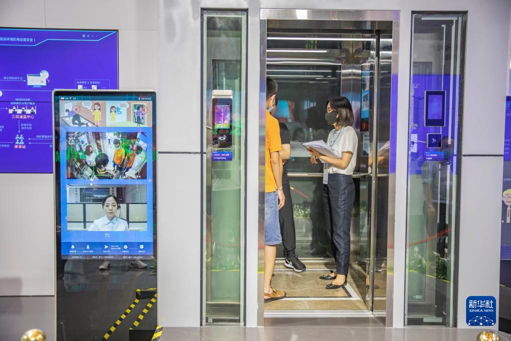 8月21日,在2022智博會(huì )重慶館內,工作人員帶媒體記者體驗智慧電梯的實(shí)時(shí)可視化救援服務(wù)。新華社記者 黃偉 攝