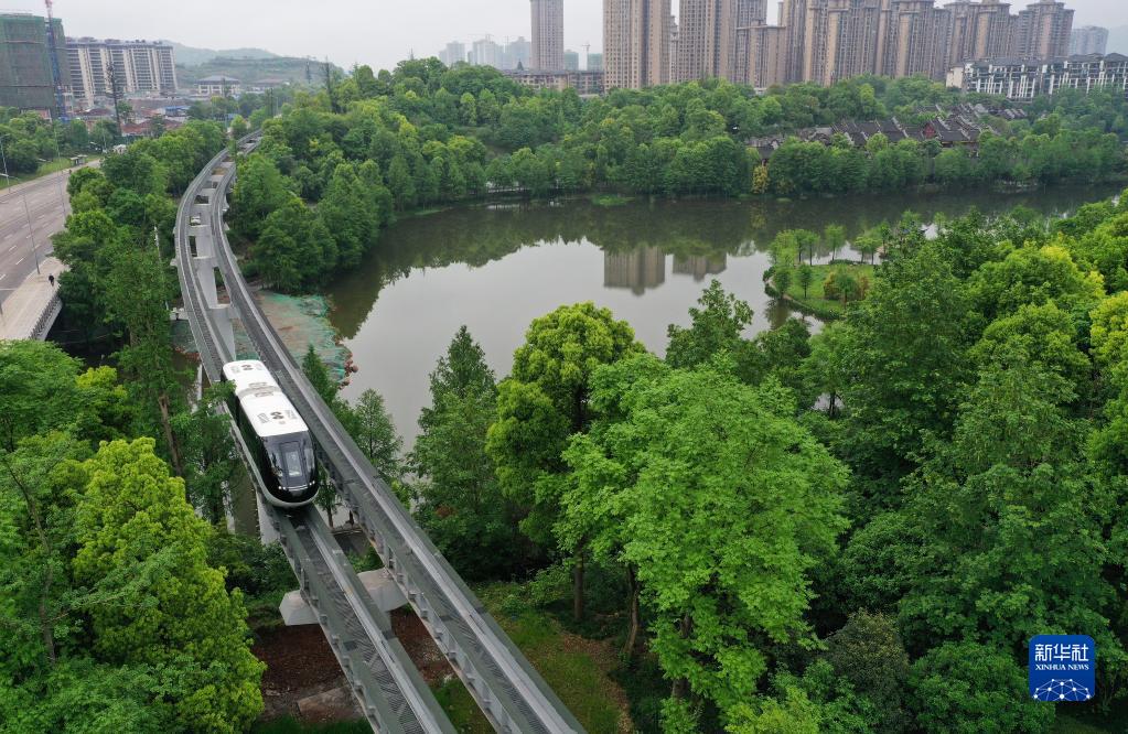 重慶首條自動(dòng)駕駛“云巴”在重慶璧山城區行駛(2021年4月16日攝,無(wú)人機照片)。新華社記者 王全超 攝