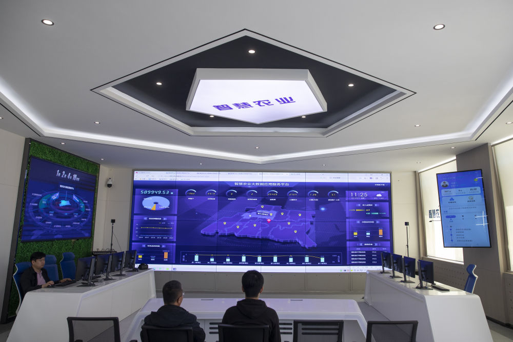 2021年5月11日,在智慧農業(yè)指揮中心,工作人員查詢(xún)無(wú)人駕駛插秧機的工作情況。