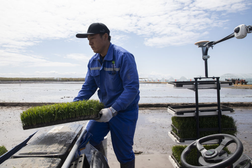 從插秧機自動(dòng)出庫,到工作人員設置定位、更換秧盤(pán),我在每個(gè)環(huán)節都拍攝了照片,但感覺(jué)整體上缺少北斗系統和工作人員的結合以及和稻田的結合。我不停地在泥濘的稻田里調整位置,正好趕上一輛無(wú)人插秧機裝完秧盤(pán),工作人員正在調整插秧機的工作路徑,我快速按下快門(mén)。白云下,黑土上,一名身著(zhù)北大荒標識服裝的工作人員坐在插秧機上調整線(xiàn)路,車(chē)身上的5G信號接收器、高清攝像頭與秧盤(pán),這些智慧農業(yè)的元素讓我看到了端牢中國飯碗的底氣!