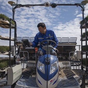 2021年5月11日,工作人員操作無(wú)人駕駛插秧機準備作業(yè)。
