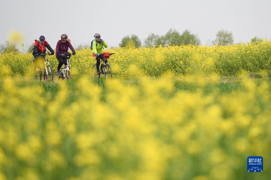 2020年3月24日,游客在合肥市巢湖北岸的油菜花田間騎行。新華社記者 張端 攝