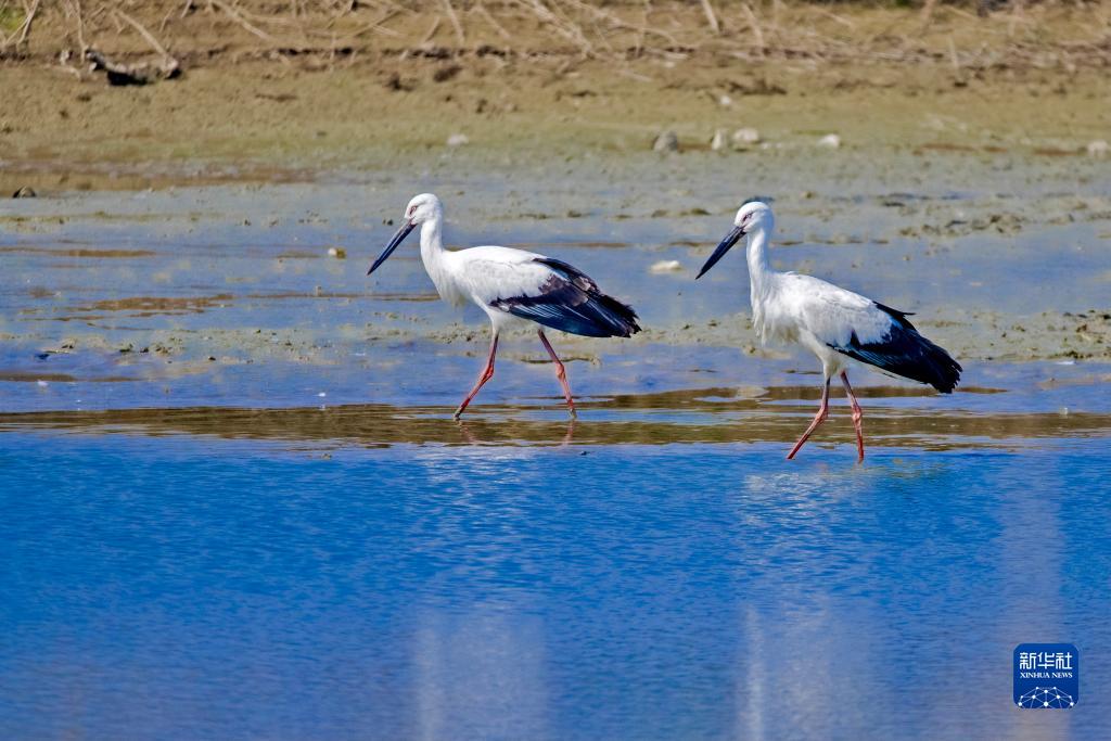 2020年10月30日,越冬的東方白鸛在合肥市巢湖半島濕地覓食。新華社發(fā)(蔡培毅 攝)