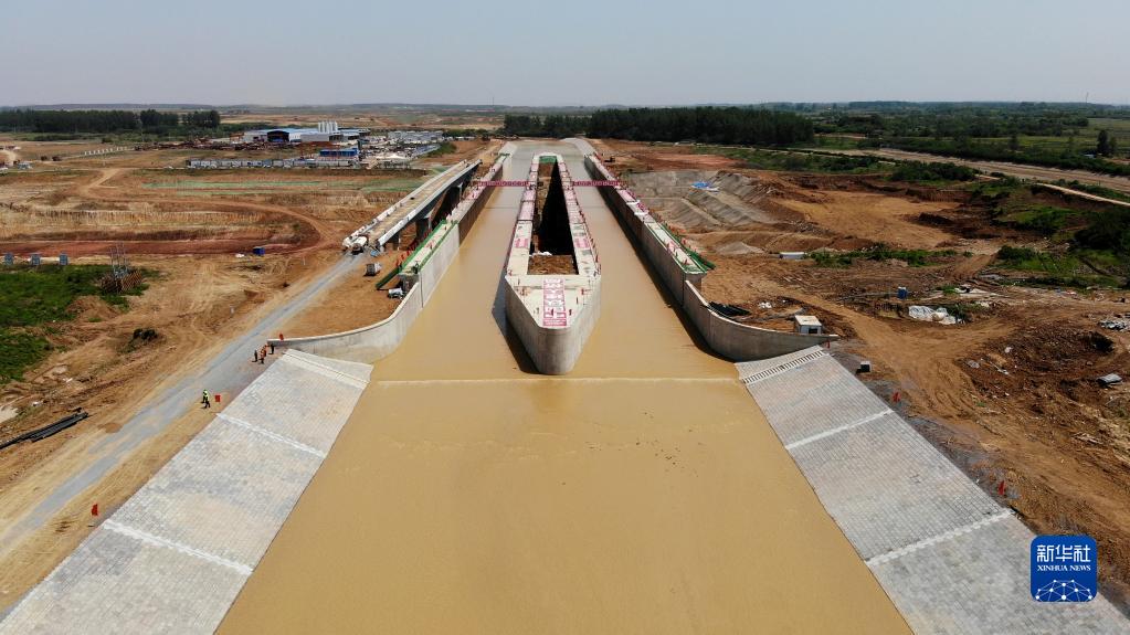 這是2021年5月1日拍攝的通水后的引江濟淮淠河總干渠渡槽(無(wú)人機照片)。新華社記者 黃博涵 攝