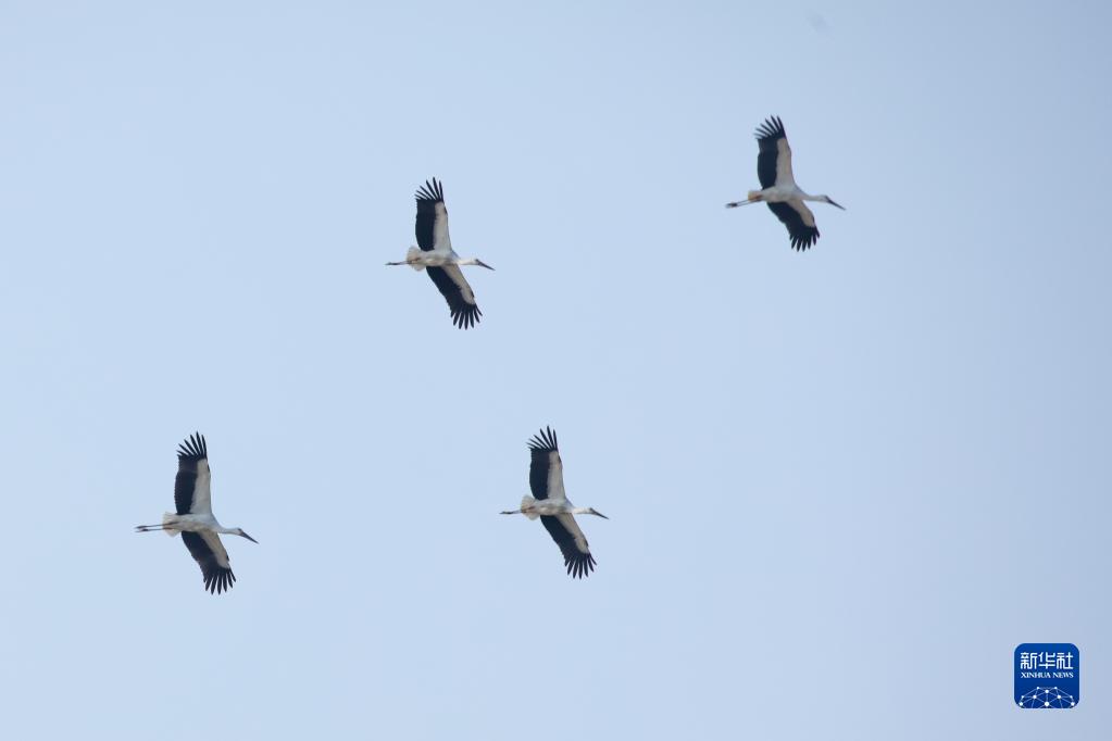 2020年10月30日,越冬的東方白鸛在合肥市巢湖半島濕地上空飛翔。新華社發(fā)(陳世萍 攝)