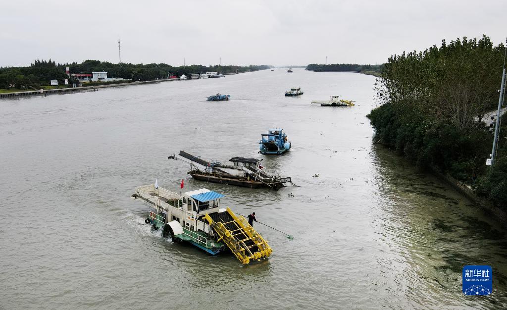 蘇浙滬三地的保潔船在太浦河水域聯(lián)合清理水面浮游植物(2020年10月15日攝,無(wú)人機照片)。當日,來(lái)自蘇州市吳江區、上海市青浦區和嘉興市嘉善縣的三名河長(cháng)在位于長(cháng)三角生態(tài)綠色一體化發(fā)展示范區的蘇浙滬交界水域太浦河流域附近開(kāi)展聯(lián)合巡河活動(dòng)。新華社記者 方喆 攝
