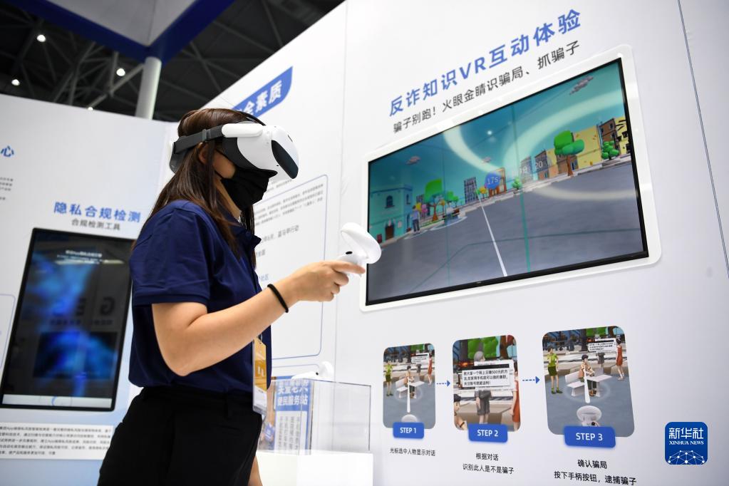 9月4日,一家參展企業(yè)代表在2022年國家網(wǎng)絡(luò )安全宣傳周網(wǎng)絡(luò )安全博覽會(huì )上演示反詐知識VR互動(dòng)體驗項目。新華社記者 劉軍喜 攝