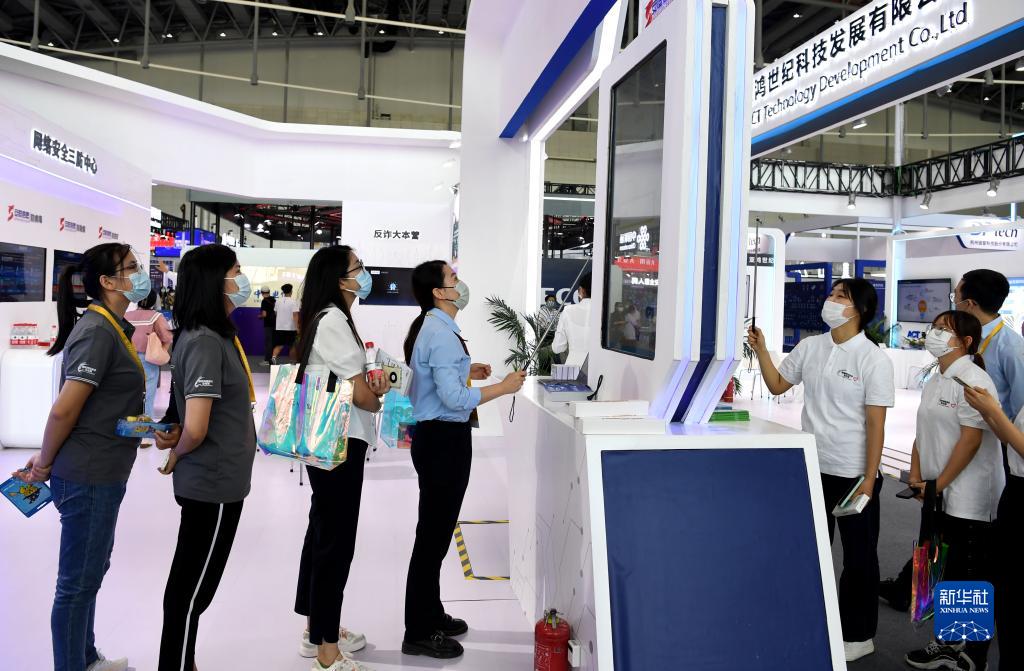9月5日,參展人員在2022年國家網(wǎng)絡(luò )安全宣傳周網(wǎng)絡(luò )安全博覽會(huì )上介紹防詐保險。新華社記者 劉軍喜 攝