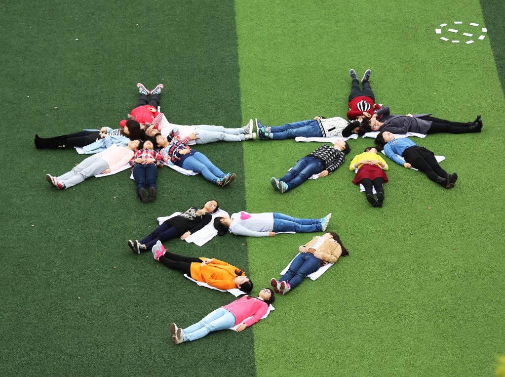 圖為湖南南華大學(xué)護理學(xué)院的志愿者在學(xué)校足球場(chǎng)舉行“睡入夢(mèng)鄉”行為藝術(shù)