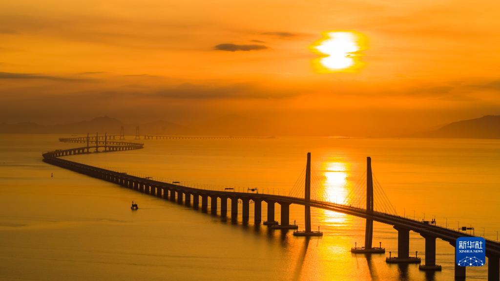 港珠澳大橋海上日出(2019年8月7日攝,無(wú)人機照片)。新華社發(fā)