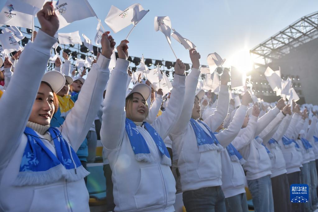 2019年12月5日,志愿者代表在北京2022年冬奧會(huì )和冬殘奧會(huì )賽會(huì )志愿者全球招募啟動(dòng)儀式上揮舞旗幟歡呼。新華社記者 彭子洋 攝