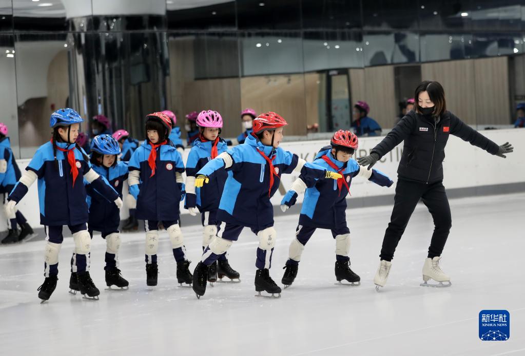 在上海新世界城的冰雪樂(lè )園,黃浦區盧灣一中心小學(xué)的學(xué)生在教練的指導下練習滑冰(2021年12月22日攝)。新華社記者 劉穎 攝