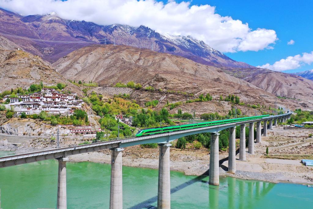 復興號列車(chē)行駛在西藏朗縣境內(2022年4月14日攝)。 新華社記者 覺(jué)果 攝