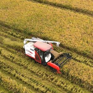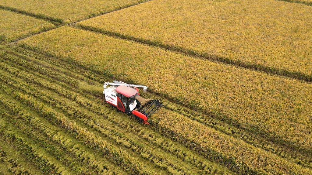 9月28日,合肥市肥西縣花崗鎮河豐社區村民駕駛收割機收獲中稻(無(wú)人機照片)。新華社記者 劉軍喜 攝