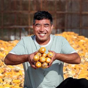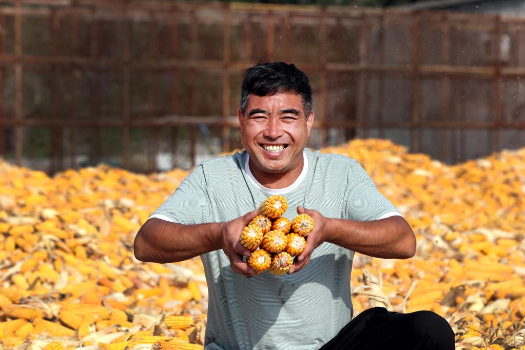 9月22日,在河南焦作博愛(ài)縣磨頭鎮崔莊村,“70后”崔衛民展示今年豐收的玉米。新華社發(fā)(程全攝)