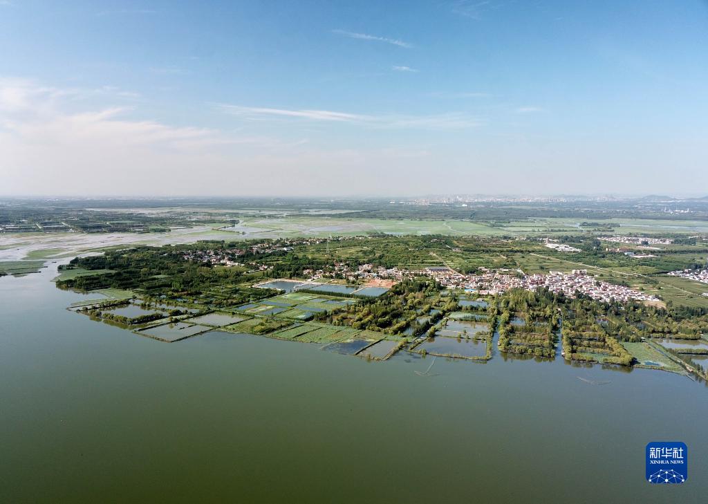 這是生態(tài)環(huán)境優(yōu)美的微山湖和微山島(2022年8月24日攝,無(wú)人機照片)。新華社記者 徐速繪 攝