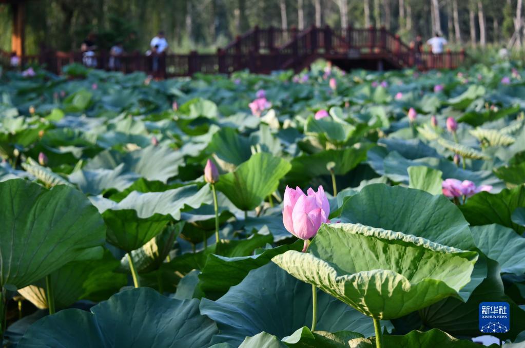 微山湖湖區內荷花盛開(kāi)(2022年7月21日攝)。新華社記者 徐速繪 攝