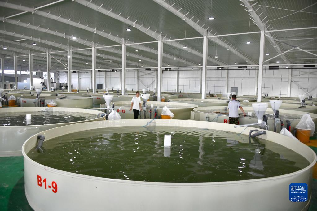 這是山東省微山縣現代漁業(yè)產(chǎn)業(yè)園內的智慧漁業(yè)車(chē)間(2022年8月23日攝)。新華社記者 徐速繪 攝