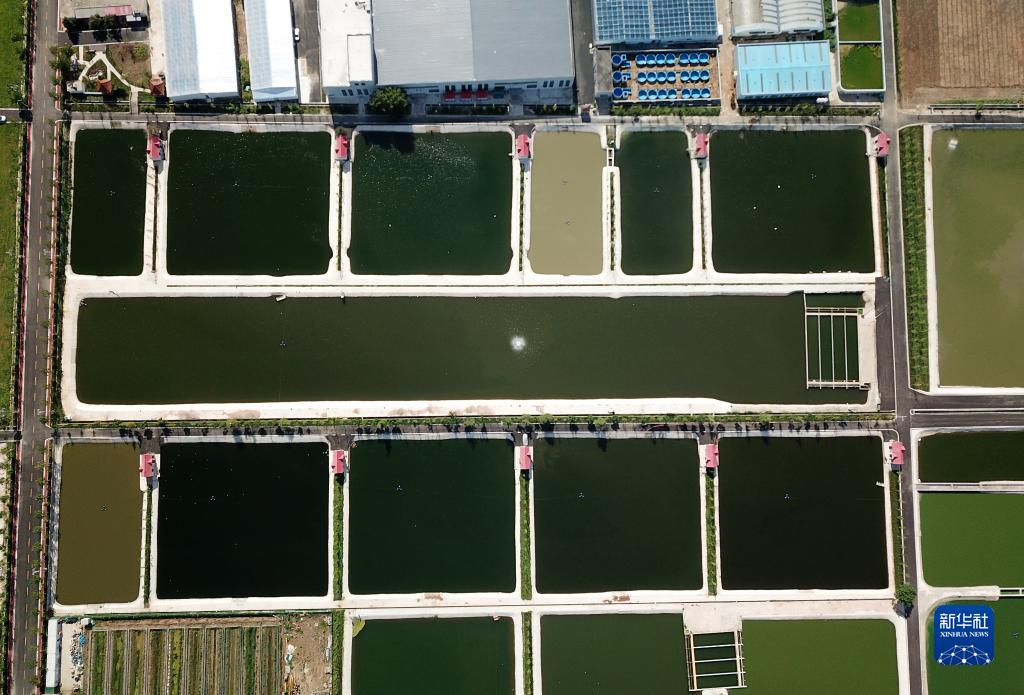 從空中俯瞰山東省微山縣現代漁業(yè)產(chǎn)業(yè)園生態(tài)魚(yú)塘(2022年8月23日攝,無(wú)人機照片)。新華社記者 徐速繪 攝