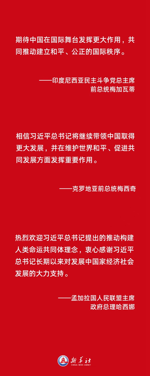 這是黨心所向、民心所盼、眾望所歸,是歷史的選擇,人民的選擇,時(shí)代的選擇。各國政黨政要感佩于這份源自中共全黨和中國人民衷心擁戴的崇高威望,通過(guò)賀電賀函表達他們對習近平總書(shū)記再次全票當選的祝賀與敬佩之情。