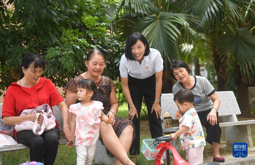 二十大代表、廣東省佛山市禪城區古灶村黨委書(shū)記、村委會(huì )主任陸秀興(右三)和村民在一起聊天(2022年9月7日攝)。新華社記者 盧漢欣 攝