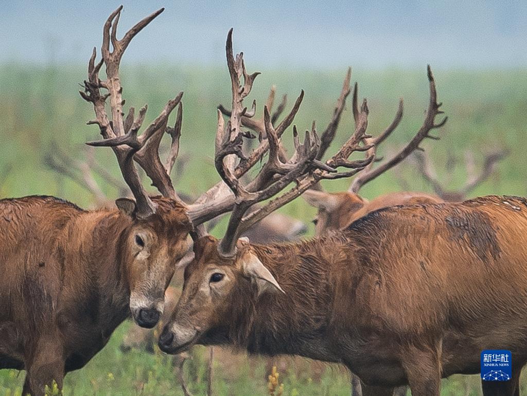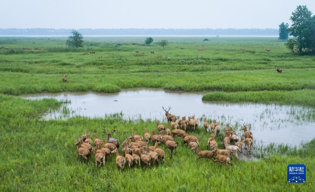 麋鹿在湖北石首麋鹿國家級自然保護區內活動(dòng)(2021年5月17日攝)。新華社記者 肖藝九 攝
