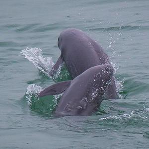 在湖北省宜昌市江邊,長(cháng)江江豚在水中嬉戲(2021年5月10日攝)。新華社記者 肖藝九 攝