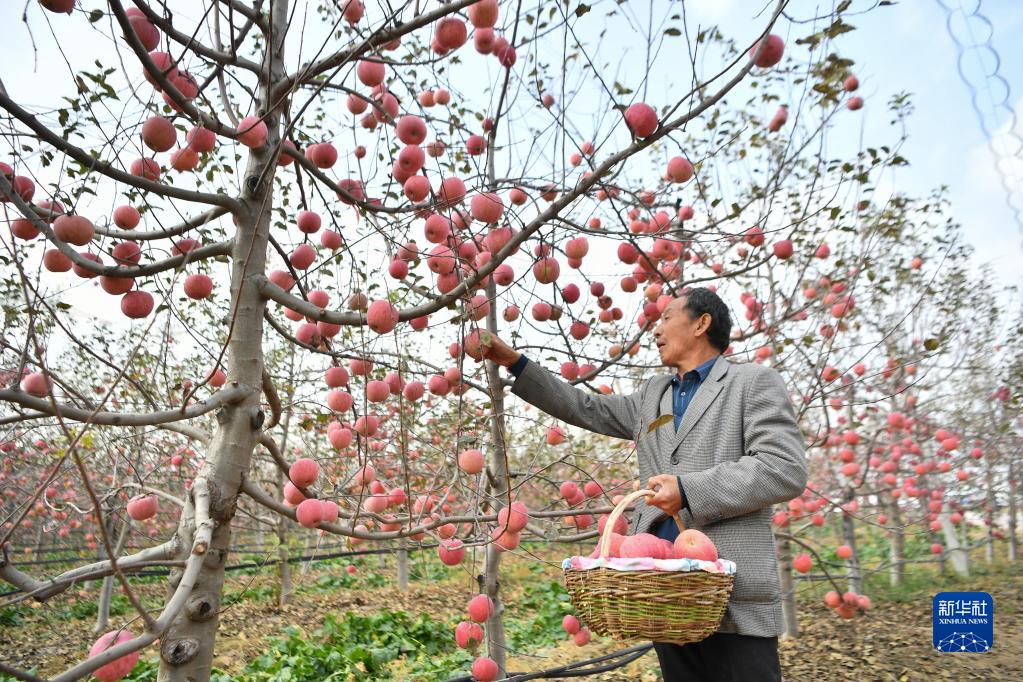 10月27日,在陜西延安市安塞區高橋鎮南溝村,果農趙永東在果園采摘蘋(píng)果。新華社記者 張博文 攝