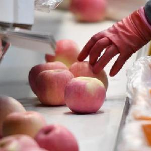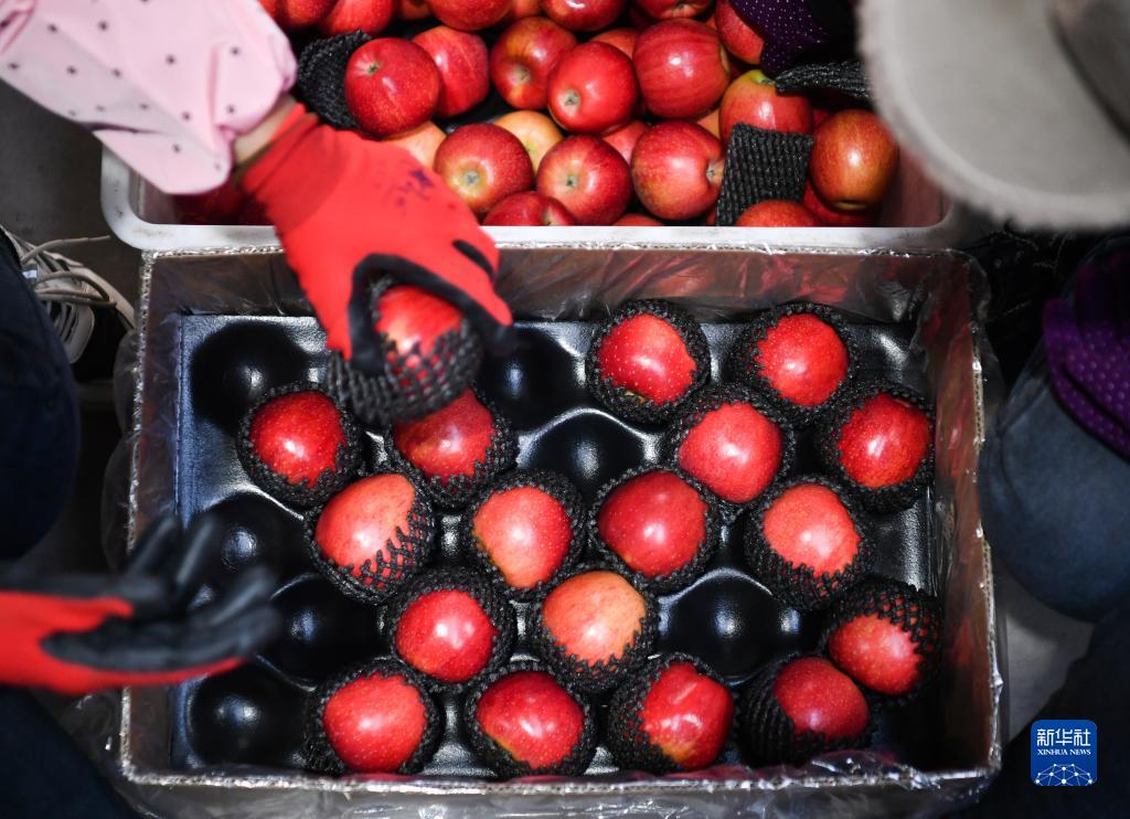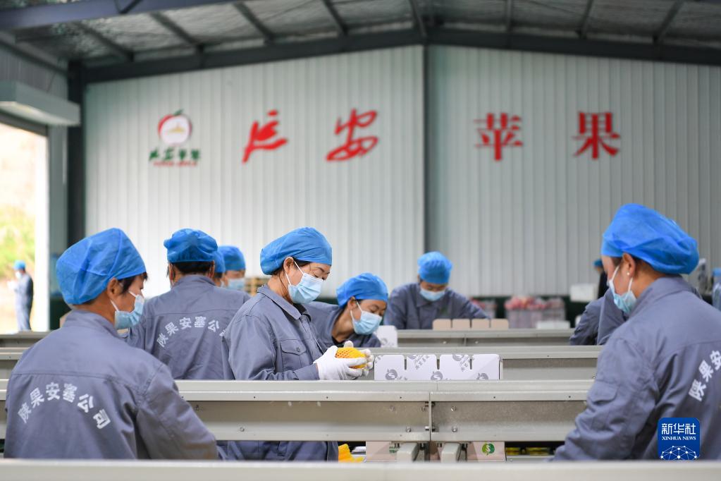 9月20日,陜西延安市洛川縣一家果業(yè)公司的工作人員在包裝線(xiàn)上忙碌。新華社記者 邵瑞 攝