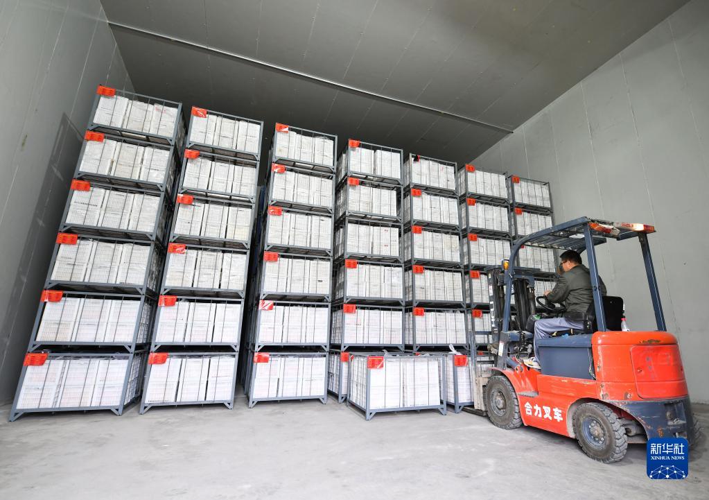 10月27日,在陜西延安市安塞區高橋鎮南溝村,工作人員在冷庫搬運蘋(píng)果。新華社記者 張博文 攝
