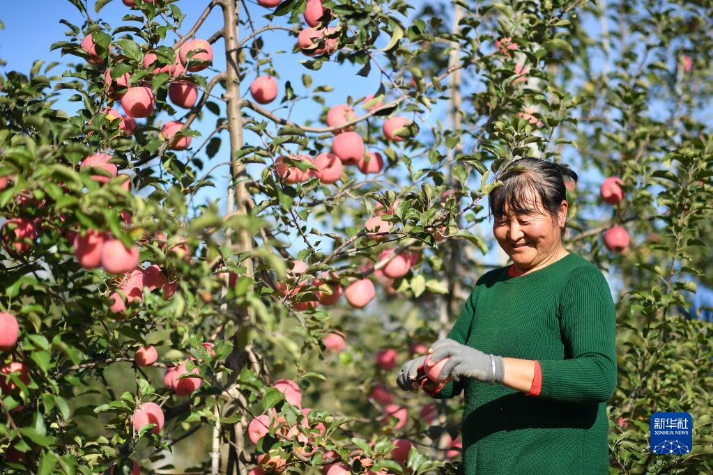 10月27日,在陜西延安市安塞區高橋鎮南溝村,果農在果園采摘蘋(píng)果。新華社記者 張博文 攝