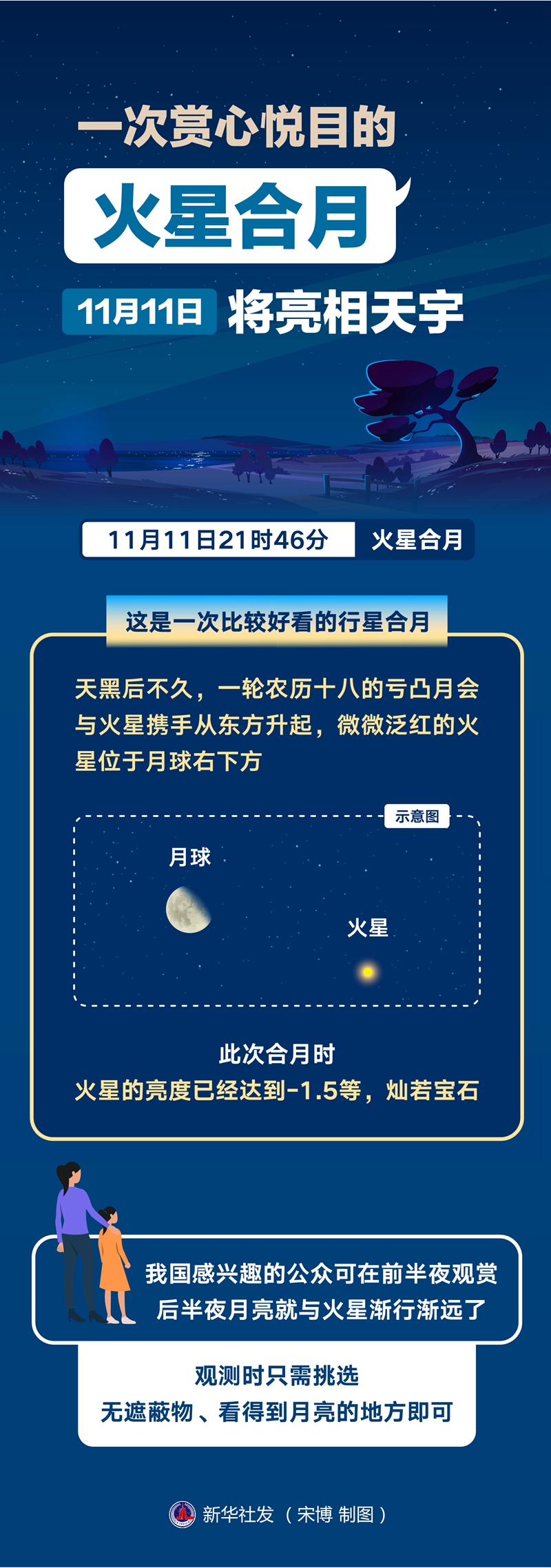 新華社天津11月9日電(記者周潤?。┪⑽⒎杭t的火星與皎潔明亮的月球近距離“相遇”會(huì )擦出怎樣的火花?天文科普專(zhuān)家介紹,11月11日晚,一次賞心悅目的火星合月將亮相天宇,屆時(shí)只要天氣晴好,我國感興趣的公眾憑借肉眼就能目睹這幕浪漫的“星月童話(huà)”。