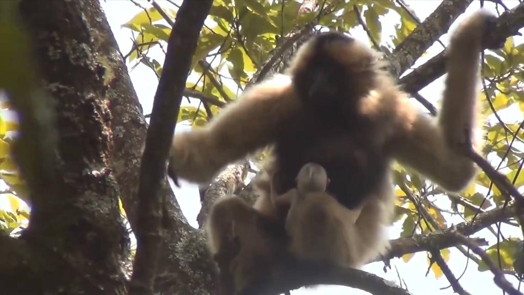 2022年上半年,無(wú)量山保護區還拍攝到“G6”群西黑冠長(cháng)臂猿再添猿寶寶,這是繼2020年后該群長(cháng)臂猿新添的又一成員。小嬰猿身體毛色為乳白色,緊抱母猿腹部,隨母猿在林間騰躍。