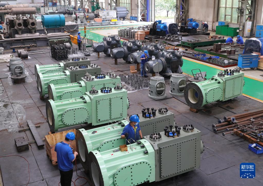在沈鼓集團,工人在總裝車(chē)間工作(2022年6月13日攝)。新華社記者 楊青 攝