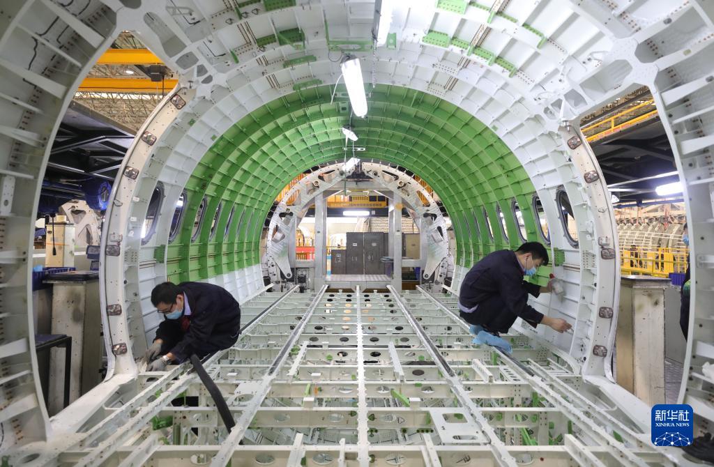 在中航沈飛民用飛機有限責任公司空客A220項目車(chē)間,工人在生產(chǎn)飛機(2020年3月6日攝)。新華社記者 楊青 攝
