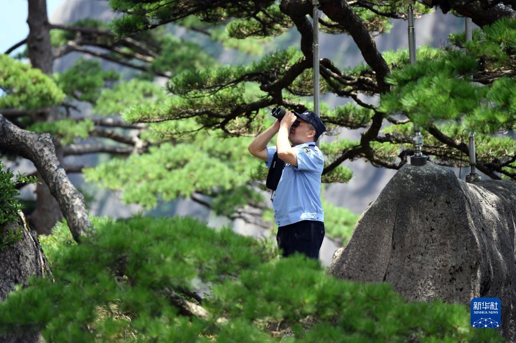 安徽黃山守松人胡曉春在例行巡查中用望遠鏡查看迎客松情況(2022年8月14日攝)。新華社記者 周牧 攝