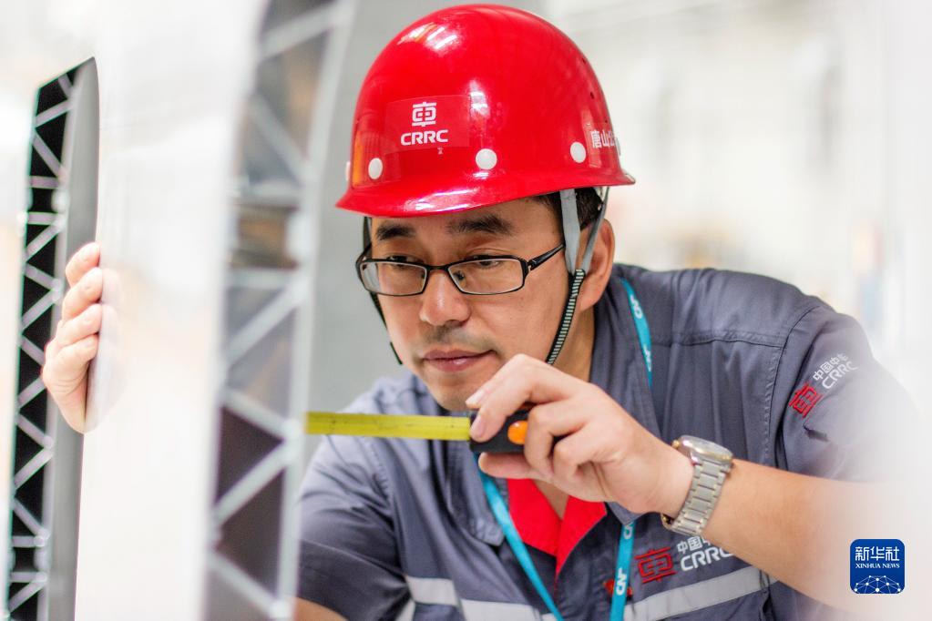 中國中車(chē)唐山機車(chē)車(chē)輛有限公司車(chē)體事業(yè)部高級技師張雪松在車(chē)體總成工序檢查尺寸(2016年7月攝,資料照片)。新華社發(fā)(王衛平 攝)