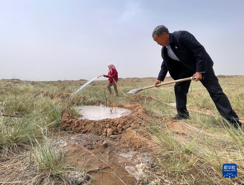 在甘肅省武威市古浪縣八步沙林場(chǎng),場(chǎng)長(cháng)郭萬(wàn)剛(右)與林場(chǎng)職工為新種樹(shù)苗澆水(2022年5月6日攝)。新華社記者 郭剛 攝